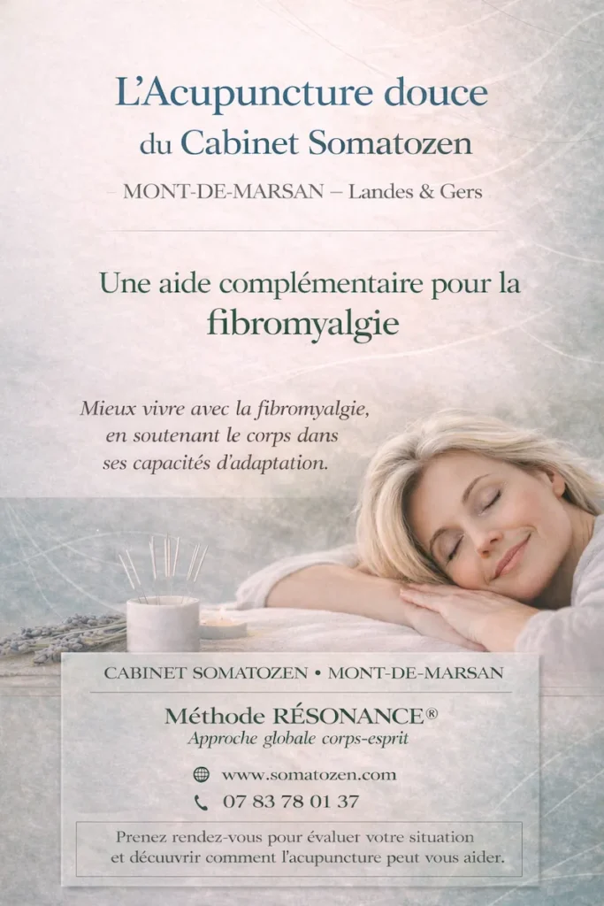 Au Cabinet Somatozen, situé à Mont-de-Marsan, l’acupuncture douce s’inscrit comme une aide complémentaire dans l’accompagnement des personnes vivant avec la fibromyalgie, lorsque le suivi médical a permis d’écarter toute pathologie nécessitant une prise en charge spécifique.